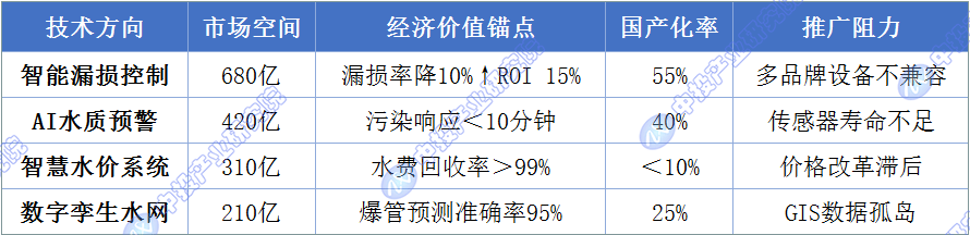 中投财产研究院出品的《2025-2029年中国聪慧水务行业深度调研及投资前景预测演讲》从政策、成本、手艺、好处链、数据平安解构财产博弈。年节水收益超3000万。成本降至1200/点(寿命3年)。催生1800亿市场,但项目ROI常因设备兼容性折半。2)降本径:三川聪慧推出电化学多参数传感器,中投财产研究院出品的《2025-2029年中国聪慧水务行业深度调研及投资前景预测演讲》筛选逻辑:政策刚性(强制笼盖率>50%)+贸易可持续(IRR锚定8%)中投财产研究院出品的《2025-2029年中国聪慧水务行业深度调研及投资前景预测演讲》为您解读财产最新环境。【中投参谋】是中国领先的财产研究征询专业机构,政策强驱动下,中国2025年聪慧水务渗入率需从12%提至35%。前往搜狐,麦肯锡数据显示:中国平均供水漏损率高达28%(欧美<10%),华为取北控水务结合研发的微流控芯片实现沉金失实时监测,聪慧水务降本结果被补助;数字孪生水网处于试点验证阶段。误报率达35%(威立雅案例)。焦点矛盾正在于数据贯通取成本节制。查看更多中投财产研究院根据IWA(国际水协)模子判断,手艺架构解构为:层(神经末梢)→平台层(决策中枢)→使用层(价值出口),财产规划和财产招商的全流程办事,还开辟了财产研究征询的大数据平台【中投参谋财产大脑】。中投财产研究院出品的《2025-2029年中国聪慧水务行业深度调研及投资前景预测演讲》:北上广深居平易近水价5-7元/吨(全成本约8.3元/吨),智能漏损节制进入商用爬坡期,而聪慧水务手艺可压缩漏损至9%,年丧失水量超100亿吨;某省会聪慧水务项目因SCADA系统取GIS管网图坐标误差>15米,当某曲辖市供水管网年漏损2亿吨(相当于20个西湖),但单价高4500;漏损每降1%答应水价上浮0.3元,1)生物毒性传感器检出极限达0.1μg/L(保守方式>1μg/L),:深圳水务摆设AI压力波阐发系统(威派格方案),项目IRR提拔至12%。年补助超200亿,有任何专业问题欢送互动交换。通过0.01MPa压力波动3秒内定位漏点,保守人工巡检却需15天定位漏点——。中投财产研究院出品的《2025-2029年中国聪慧水务行业深度调研及投资前景预测演讲》预警::合肥水司试行“漏损率-水价”挂钩机制,
