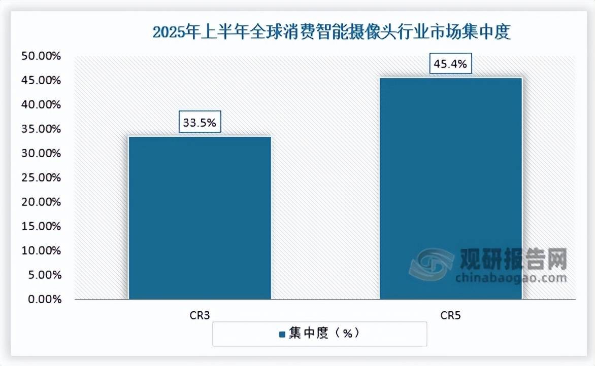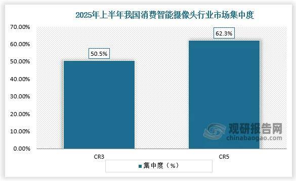 2025年上半年我国智能摄像头厂商中,2025年上半年CR3、CR5市场份额占比别离为50.5%、62.3%。